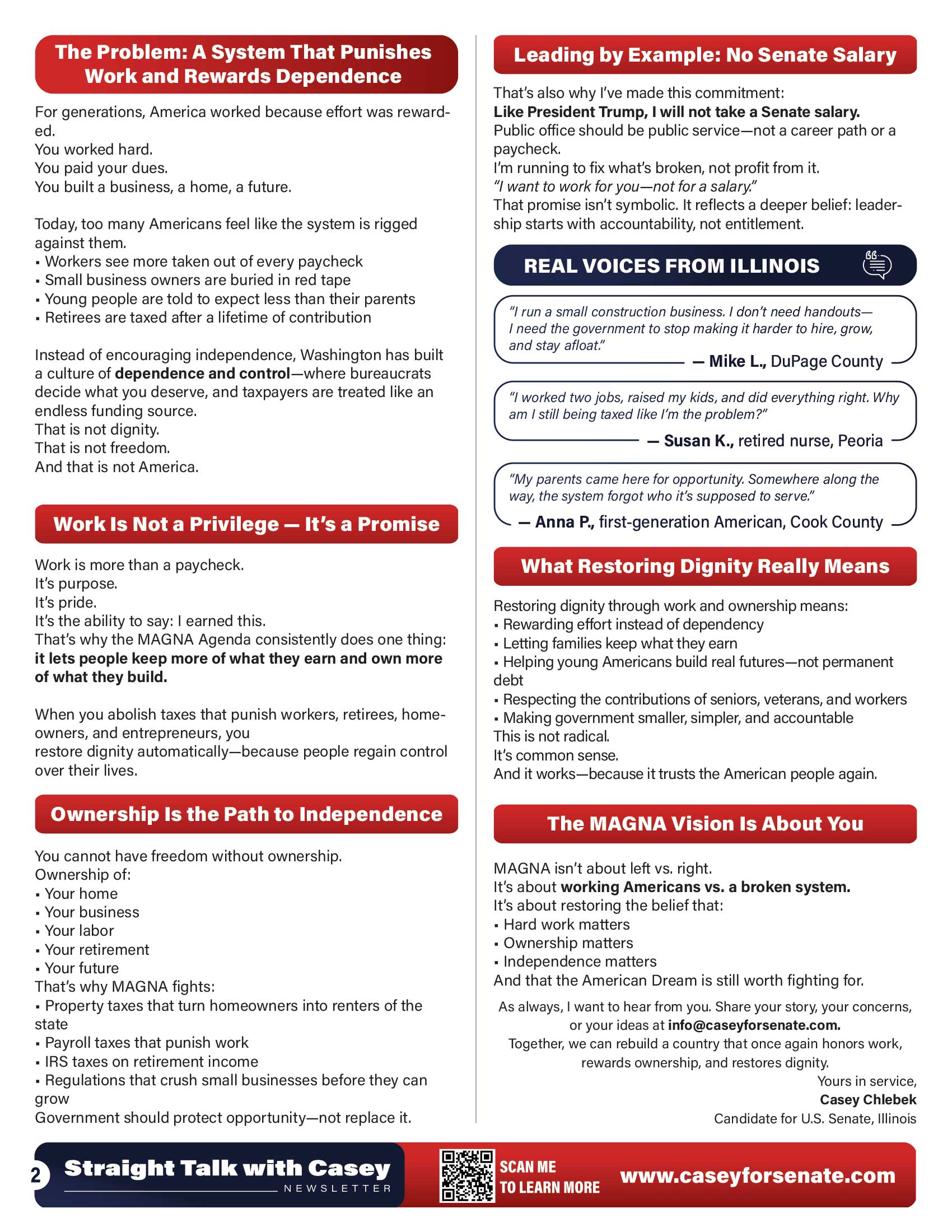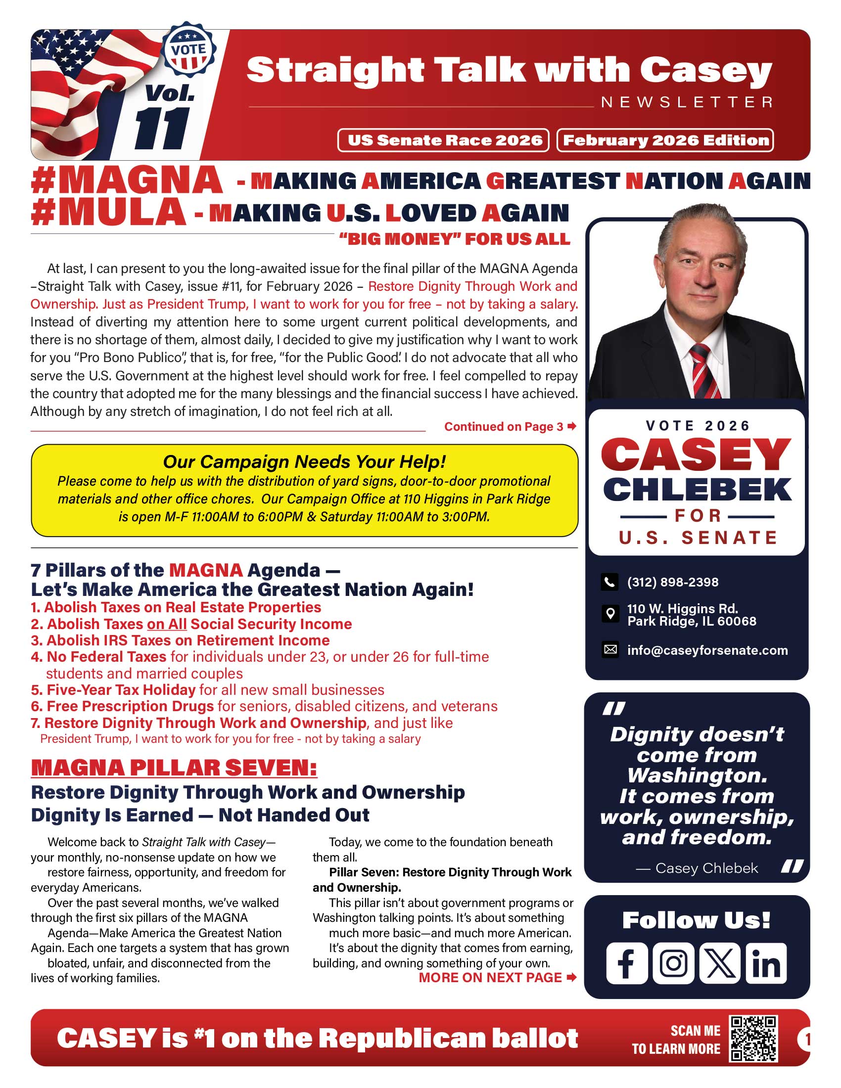 Hi, I’m Casey Chlebek and I’m running for the US Senate as Republican in Illinois. I believe that the United States needs to return to an age of openness and accountability that used to be the cornerstones of a democratic system that built the greatest country in the world. Help me by donating today or joining our team at Casey for Senate today!