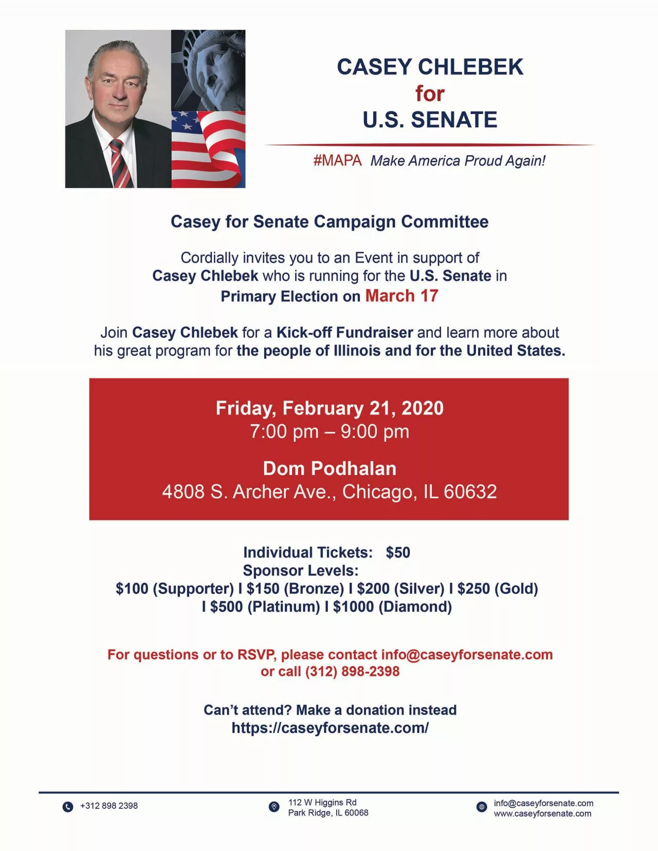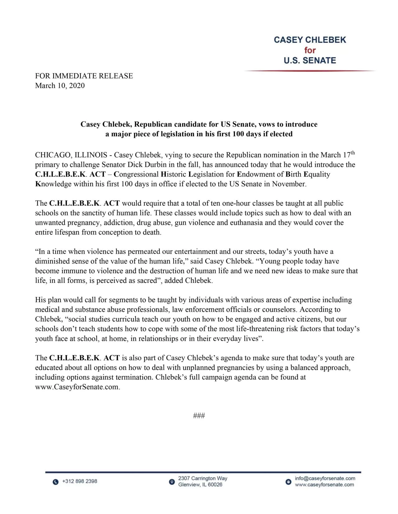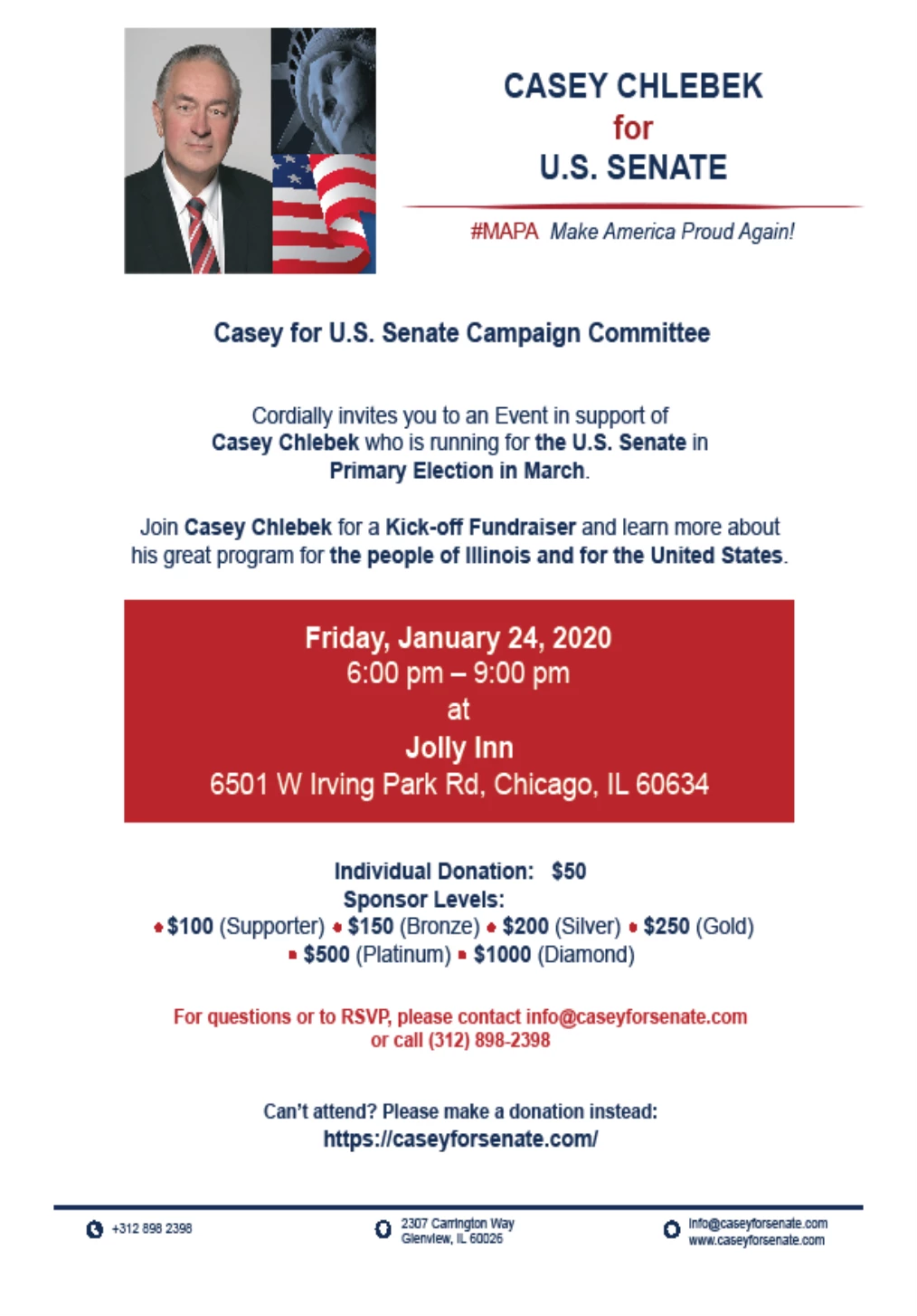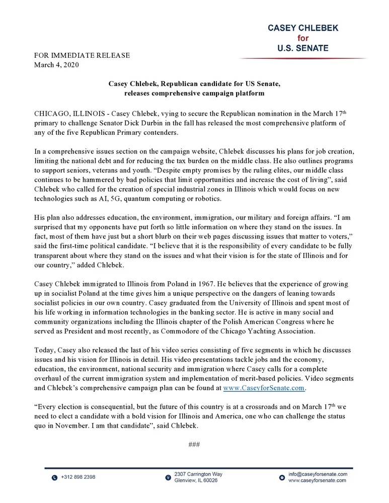 CHICAGO (January 21, 2020) – The Casey Chlebek for U.S. Senate campaign announced today that the first reception in support of Casey for Senate will take place at the Jolly Inn Restaurant & Banquet Hall,…
